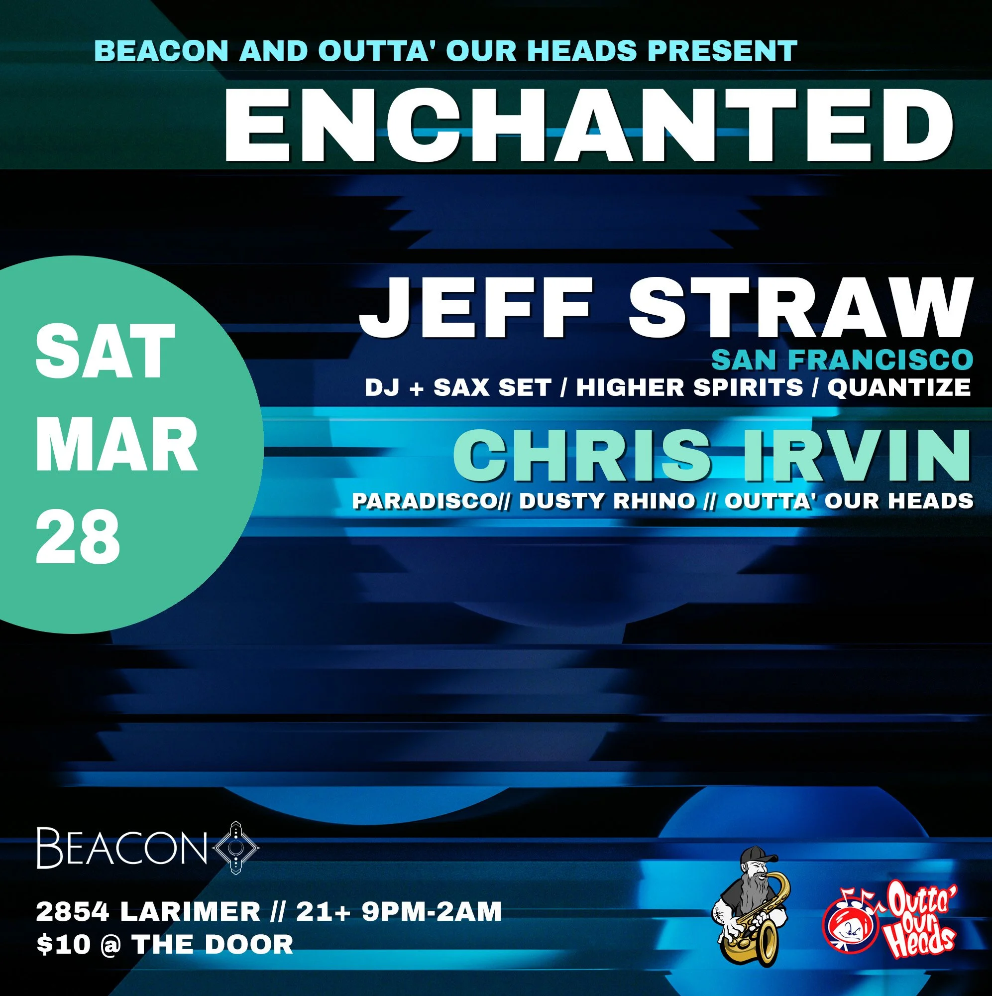 Back to All Events Enchanted (DENVER) Friday, March 28, 2025 10:00 PM 11:55 PM The Beacon 2854 Larimer Street Denver, CO, 80205 United States (map) Google Calendar ICS Beacon - Denver’s premiere nightclub is excited to welcome Jeff Straw to the decks. He will be joined by Paradisco resident Chris Irvin for a night of house music grooves, live saxophone and a damn good time.Tickets are $109pm-2am