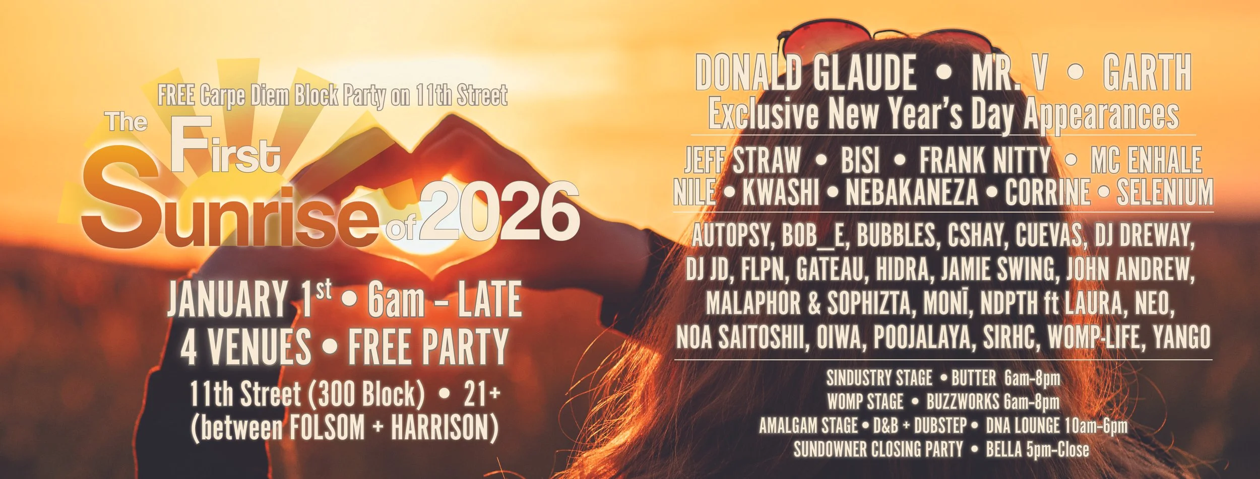 🪩 Music All Day Starting at 6am Start your year off right with the people you love and the tunes you want to hear played by some of the Bay Area’s best DJs.